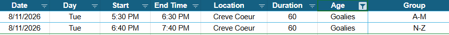 Please use the first letter of your goalie's last name. The Rockets would like to have a proportional amount of goalies per skate. We may have your goalie skate at the other time listed. A communication will be sent.